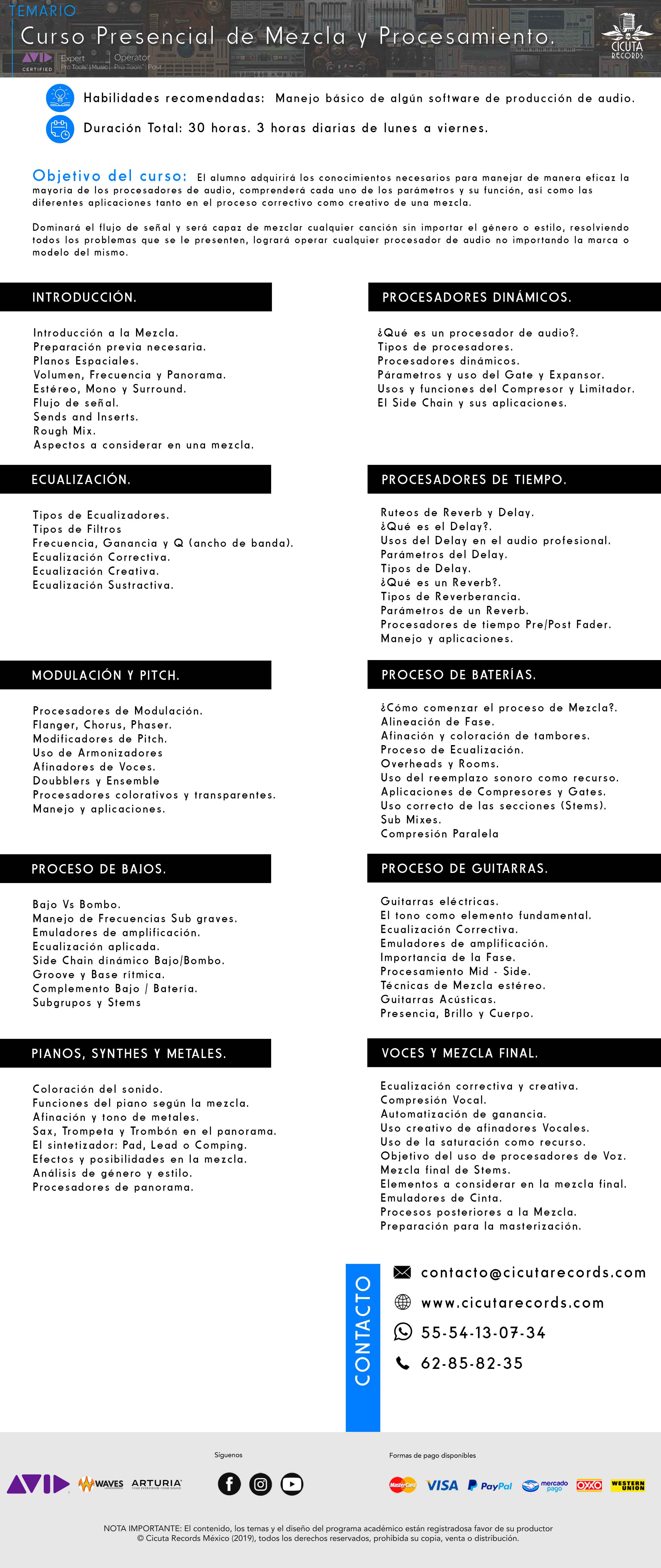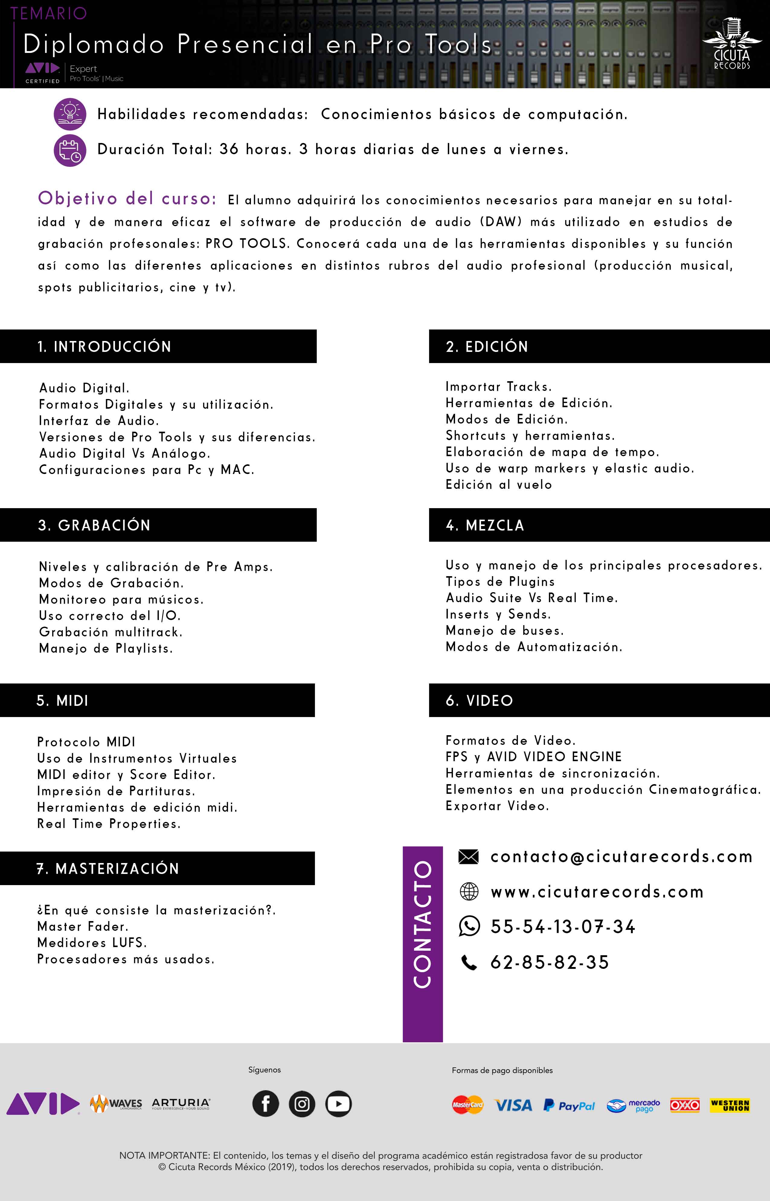 Incluye los cursos de "Diplomado en Pro Tools", "Grabación y Captura Sonora", " Mezcla y Procesamiento" y "Masterización Digital".
